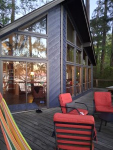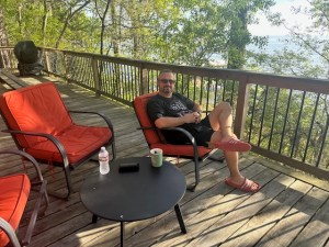 It’s morning now, and I’m sitting with a cup of Nescafé—thank you, Nena—with my feet kicked up on the coffee table. The back door is open, and the air is moving gently through the room, carrying that clean, piney scent from the trees.