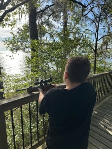 Friday felt slower, the kind of day you don’t really plan but just glide through. More fishing. Some swimming. A bit of music playing through the blue tooth speaker in the house. By late morning, Erjon had returned to the tree house deck and pulled out his pellet gun. He wanted to teach his boys how to handle it and this was the perfect place to practice.