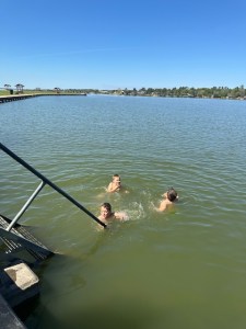 Afterward, the path returned us to our parking lot. We drove back up the road to the main intersection and saw a broad, green park with more tall trees and signs about a nearby activity center (aka: bathrooms!). We parked nearby and then—completely unplanned—the boys noticed the small beach area just beside it. After all that hiking, “we” (ahem-they) unanimously decided to swim! They stripped down to their boxers and ran to a ladder going into the deep water. After a few shrieks about how cold it was, they dared each other enough that they finally jumped in. Erjon almost went in too, but we both ended up talking to a few other nearby fishermen who were enjoying our boys’ show of bravery with the cold water.